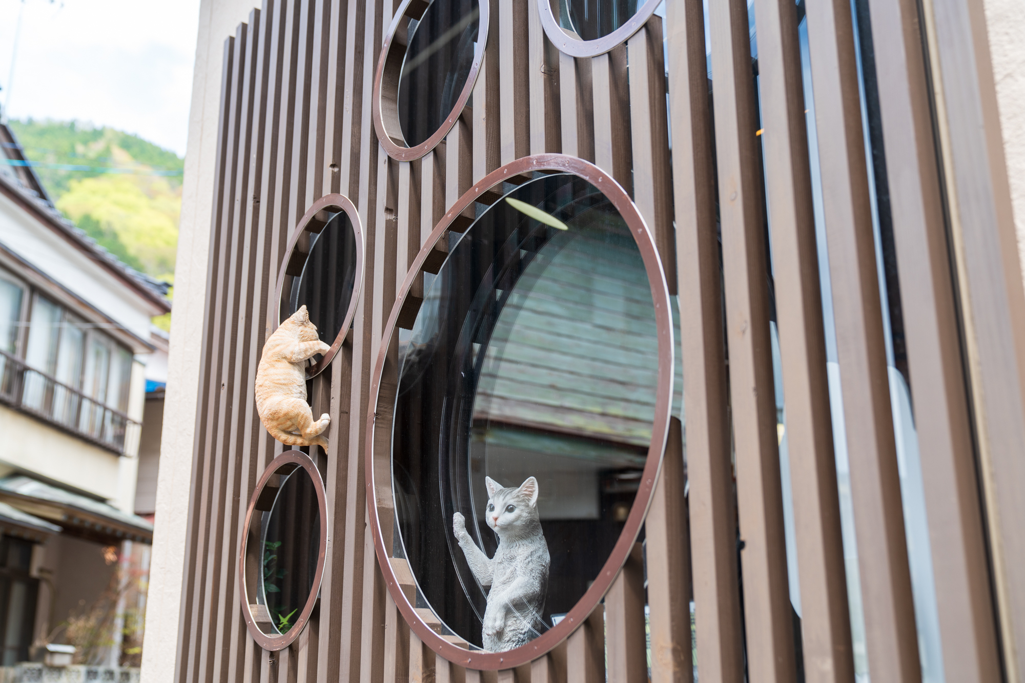 — 窓越しに猫たちを眺めながら、ゆっくりとした温泉街の午後を。