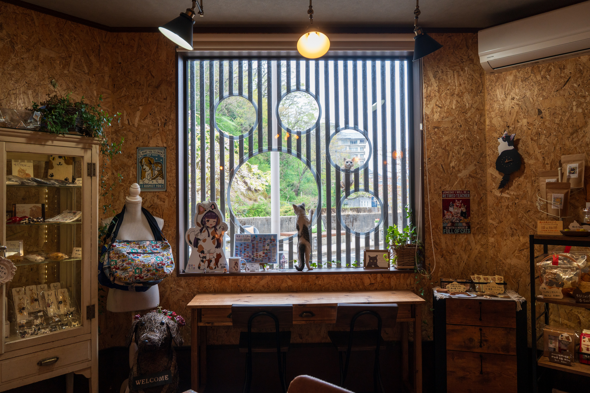 螺旋階段で繋がる二つのフロア。下は猫たちの気配とグッズ、上は温泉街の川を眺める落ち着いたラウンジ。